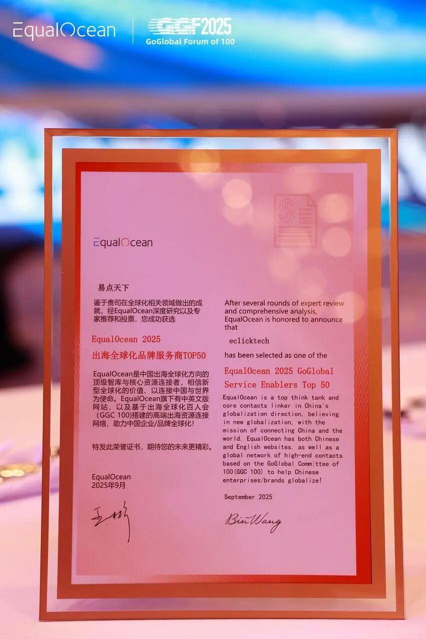 9月19-20日,由EqualOcean主办的「2025出海全球化百人论坛」在深圳圆满落幕。作为论坛的重要环节之一,“2025出海全球化”系列榜单在颁奖晚宴现场隆重揭晓。经过两个月的严格评选,最终共有120家企业/机构脱颖而出,易点天下(301171)作为全球领先的企业国际化智能营销服务集团,成功入选 “出海全球化品牌服务商TOP50”。
